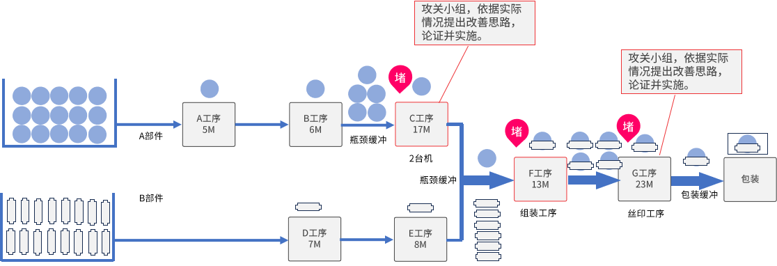 了解瓶頸崗位,彌補(bǔ)短板,動(dòng)作優(yōu)化、工具和治具改善,首工序和備料,防止停產(chǎn),減少換線時(shí)間。